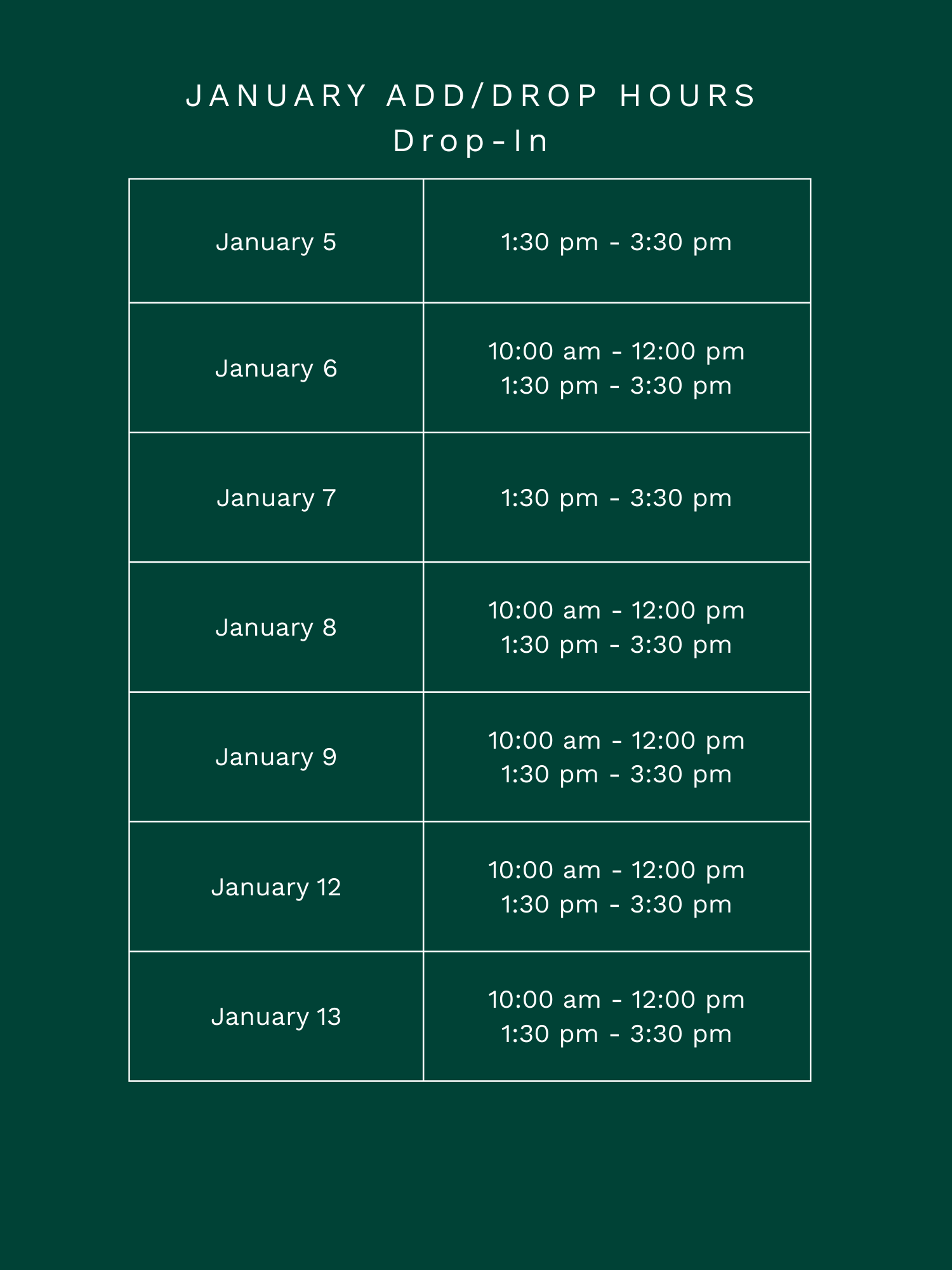 Drop-in Sessions (in-person or virtual) - 10 minutes Drop-ins are the fastest way to meet with an advisor. These short appointments are available Monday, Tuesday, Thursday afternoons between 1:30 and 3:30PM and Friday mornings between 10am and 12 noon.