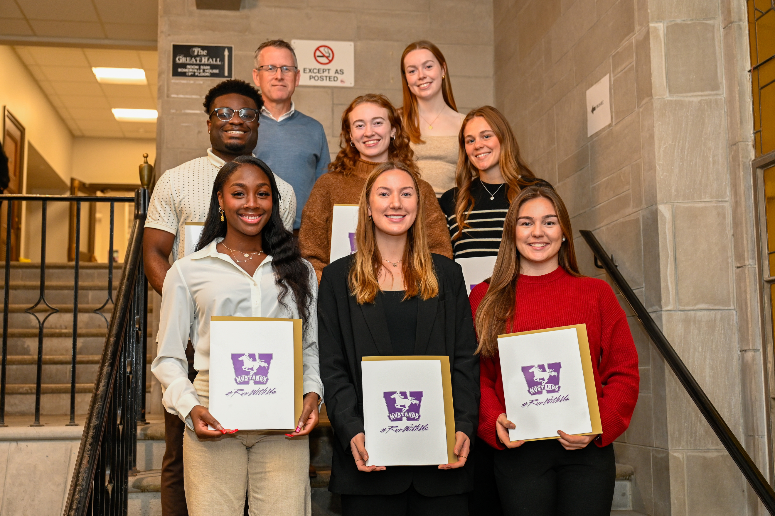 For two years in a row, King's student-athletes Shona Branton (women's swimming) and Treye Trotman (men's wrestling) earned the Female and Male Athlete of the Year Awards at the annual Mustangs awards. At the most recent Mustangs Honours Breakfast, 28 King’s students were recognized as Mustang Scholars. Approximately 75 players on the current Western Mustangs football team are King's student-athletes.