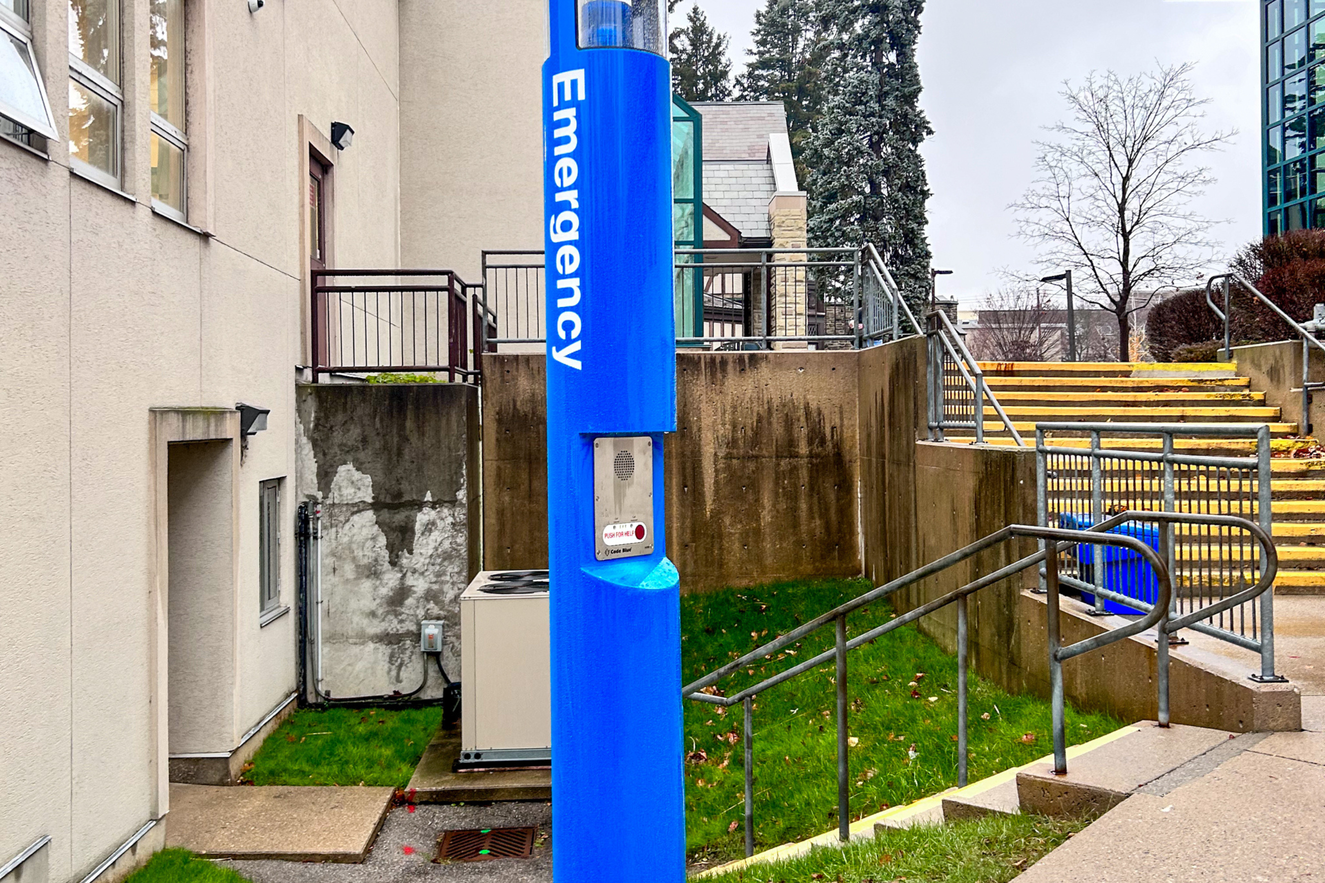 You can contact King's Security at 519-521-6215 or security@kings.uwo.ca. You can also contact them using the blue phones. Look for the tall blue towers with the blue lights – there's one on the walkway leading from parking lot #2 to the east wing of Wemple Hall, and one at the edge of parking lot #3, on the walkway between the South Annex and the library. Push the button to be connected to Security. There are also help buttons at the parking gates.