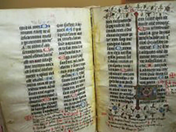 The Psalter is a manuscript book of psalms arranged for devotional use, hand-lettered in Gothic script on vellum (calf skin), and consisting of 197 leaves. Many are beautifully illuminated with floral designs in gold leaf, red, light and royal blue, green and violet. Probably from late 14th- or early 15th-century Flanders, the manuscript was purchased from a dealer in Lima, Peru, and, given its age and provenance, may have travelled to the New World with the conquistadors or early Spanish missionaries. The manuscript retains its original binding of calf or goat skin, finished with simple, hand-tooled geometric designs. The Psalter was a gift to the Library from former Chief Librarians Miss Elizabeth Russell (1986-1993) and Dr. John S. Clouston (1993-2005).