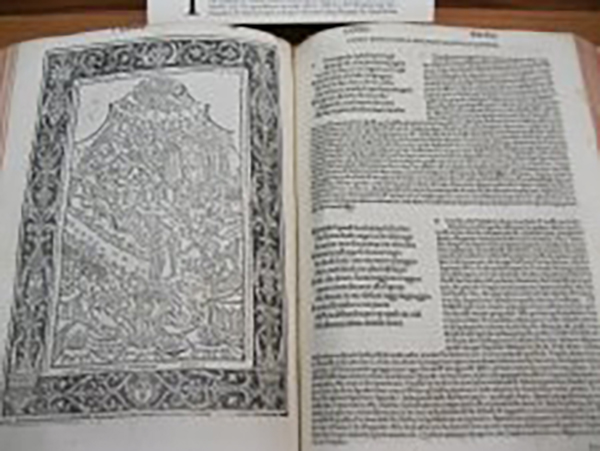 Published at Brescia, Italy, in 1487, this printed incunabular copy of Dante Alighieri’s immortal Divina Commedia (Divine Comedy) became the Cardinal Carter Library’s 100,000th title on April 2, 1998, a gift from The University of Western Ontario. Printed by Boninus de Boninis, the so-called Brescia Dante boasts 68 full-page woodcuts, each illustrating a canto of the poem. The text is surrounded by the commentary of Cristoforo Landino.