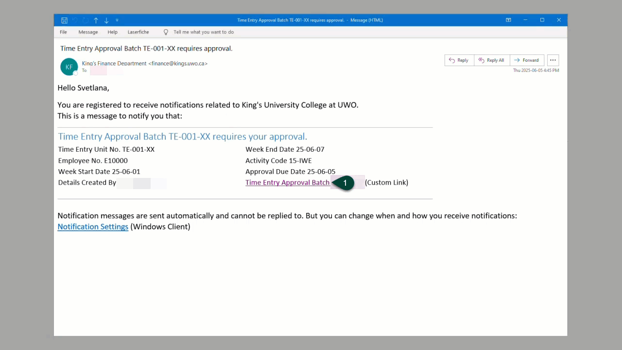 When an employee submits their timesheet, their supervisor will receive an email notification requesting approval. This email contains a direct link to the timesheet approval screen.