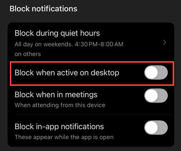 Turn off "Block when active on desktop" or "Block when active on another device" to ensure you receive notifications on your phone even while you are logged into Teams elsewhere.